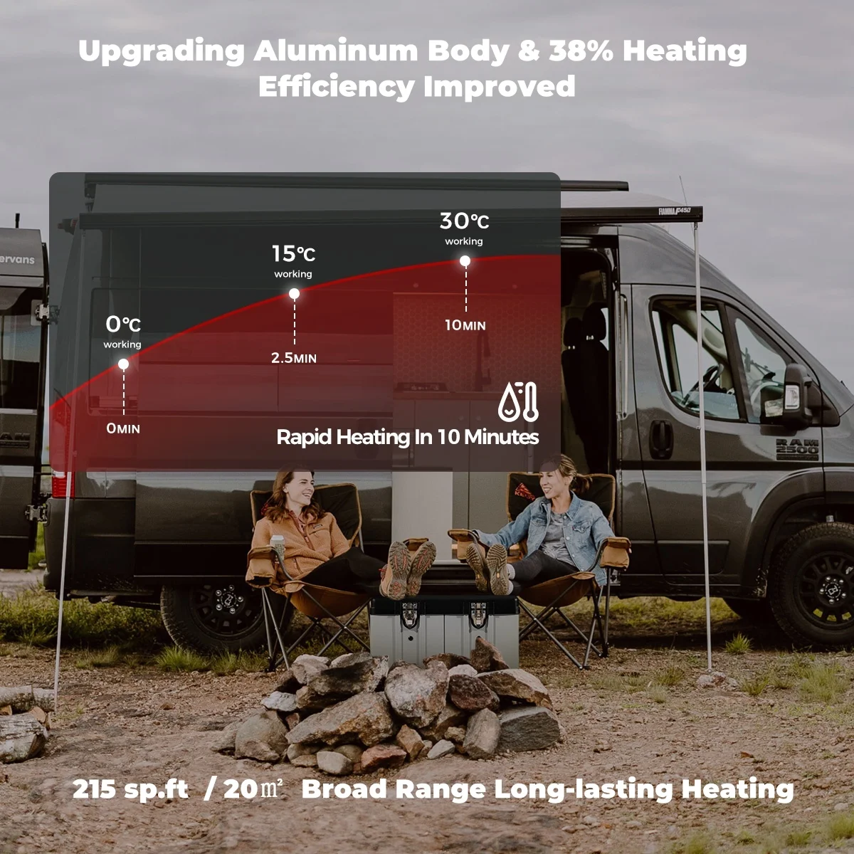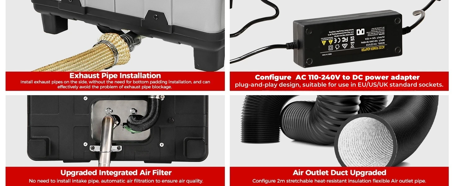 Easy Installation-free Solution: Enjoy efficient heating with our diesel heater all in one that requires no installation, making it perfect for outdoor adventures like camping. Heater Power: 8 KW; Rated Voltage: 12 V&24V, AC 110-240V. Applicable Range: 215-269ft²/20-25m². Within just 10 minutes, our innovative sandblasting aluminum heat exchanger ensures rapid and efficient heat transfer, ensuring a comfortable temperature inside your vehicle, boat, or cabin.