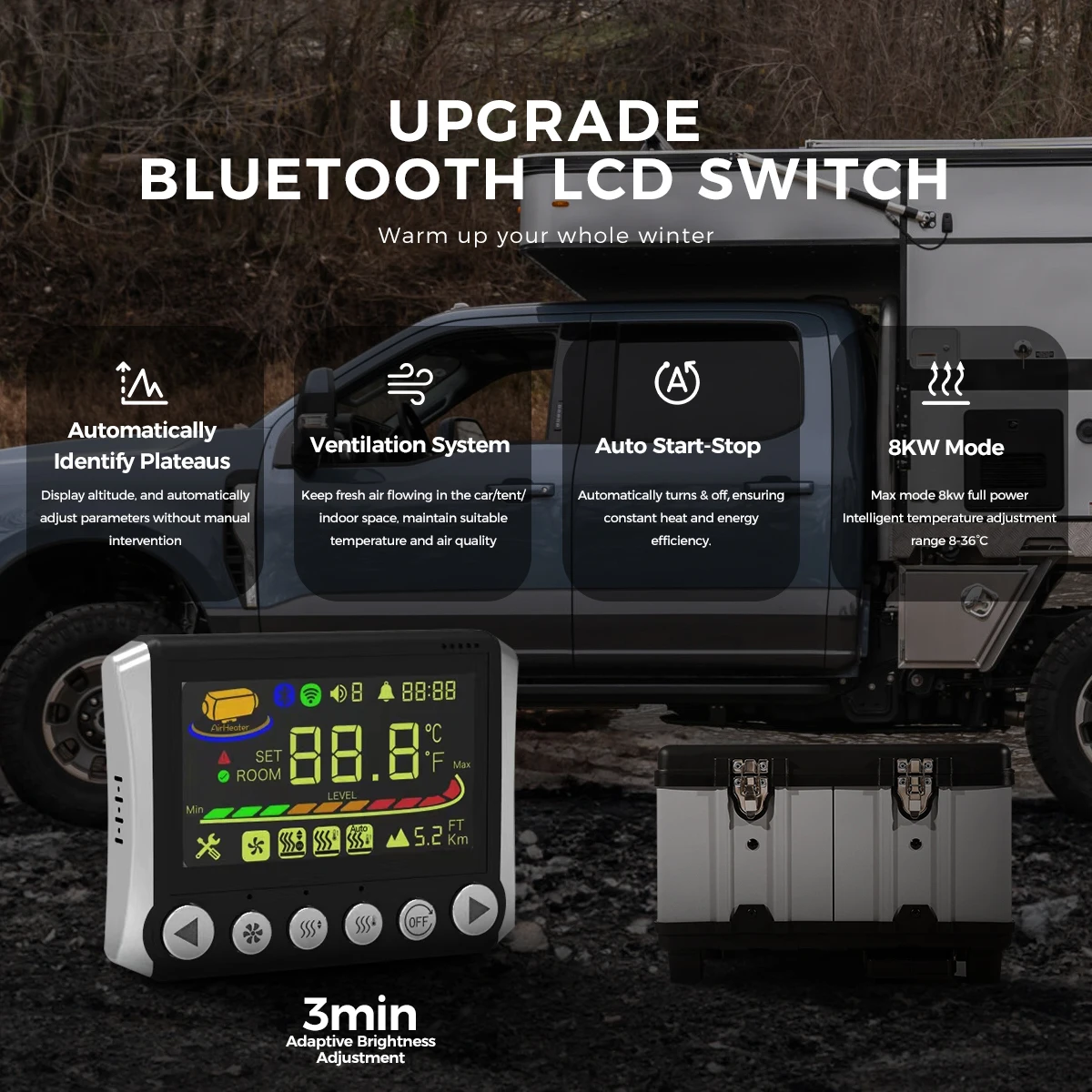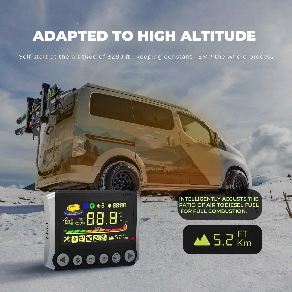 Upgraded Plateau motherboard: Our air heater can be used at high altitudes 4,500 meters above sea level. It can automatically adjust the fuel output based on the altitude of the plateau and display the altitude