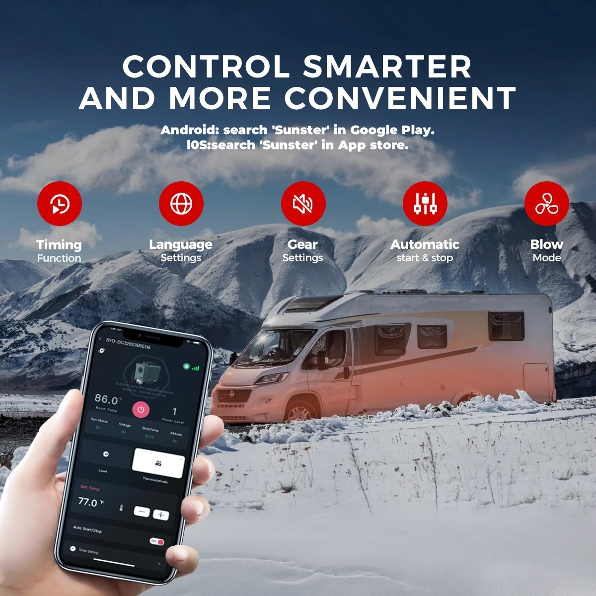 Smart APP Control:Gain complete command with the smart app, which offers precise control over temperature, timers, power levels, altitude mode, constant temperature, and Ventiation mode settings. The Sunster diesel heater experience ultimate convenience and peace of mind.