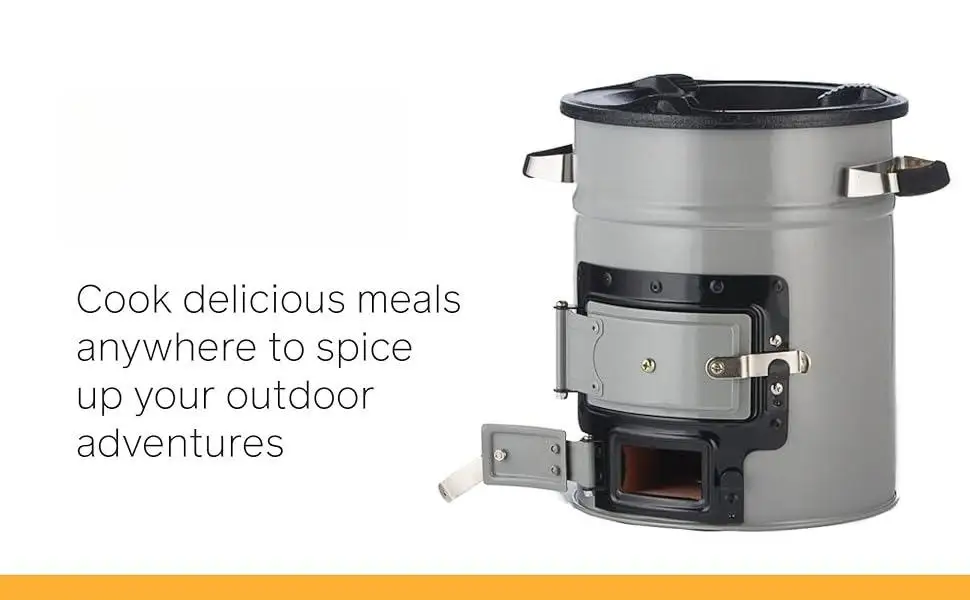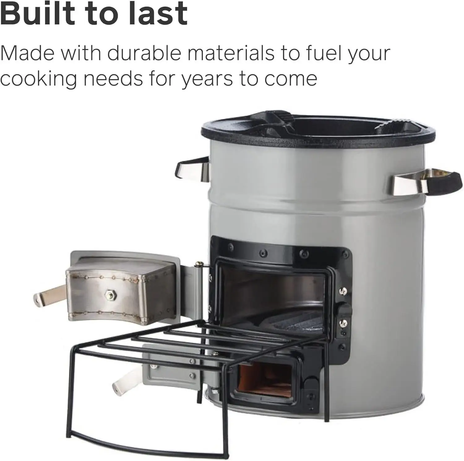 - Heavy-duty portable rocket stove burns charcoal or twigs, branches, wood and other biomass readily available outdoors, and accommodates heavy cookware such as cast iron pots and pans and Dutch ovens